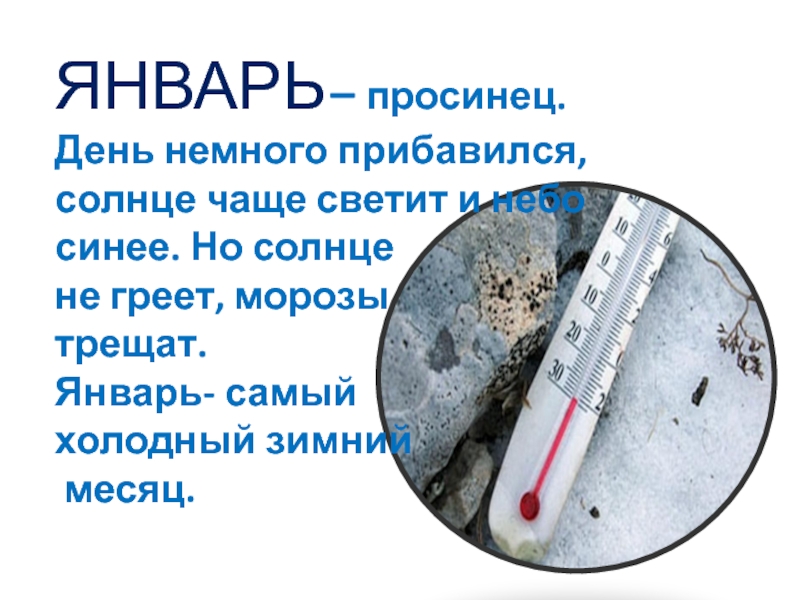 Слайд 6ЯНВАРЬ – просинец. День немного прибавился, солнце чаще светит и небо