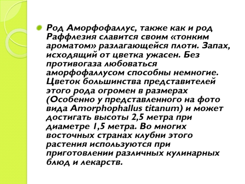 Слайд 7Род Аморфофаллус, также как и род Раффлезия славится своим «тонким ароматом»