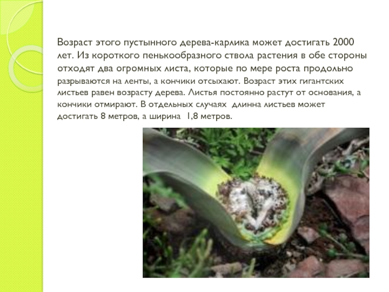 Слайд 3Возраст этого пустынного дерева-карлика может достигать 2000 лет. Из короткого пенькообразного