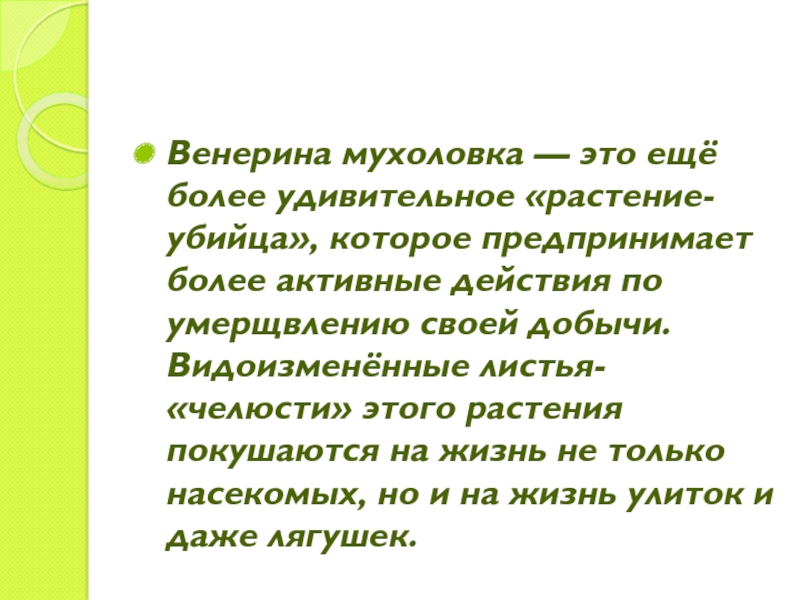 Слайд 12Венерина мухоловка — это ещё более удивительное «растение-убийца», которое предпринимает более