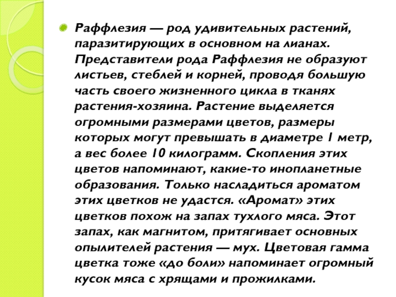 Слайд 5Раффлезия — род удивительных растений, паразитирующих в основном на лианах. Представители