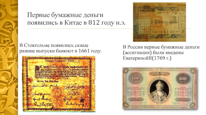В России первые бумажные деньги (ассигнации) были введены ЕкатеринойII(1769 г.)