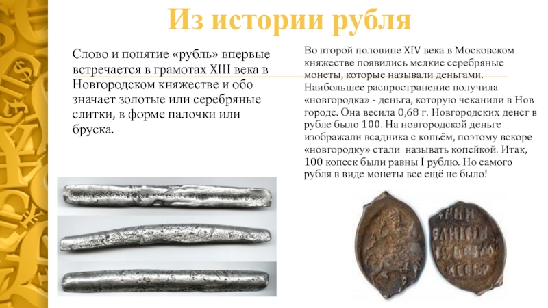 Во второй половине XIV века в Московском княжестве появились мелкие серебряные монеты, которые называли деньгами. Наибольшее распространение получила «новгородка» - деньга, которую чеканили в Новгороде. Она весила 0,68 г. Новгородских денег в рубле было 100. На новгородской деньге изображали всадника с копьём, поэтому вскоре «новгородку» стали называть копейкой. Итак, 100 копеек были равны I рублю. Но самого рубля в виде монеты все ещё не было!