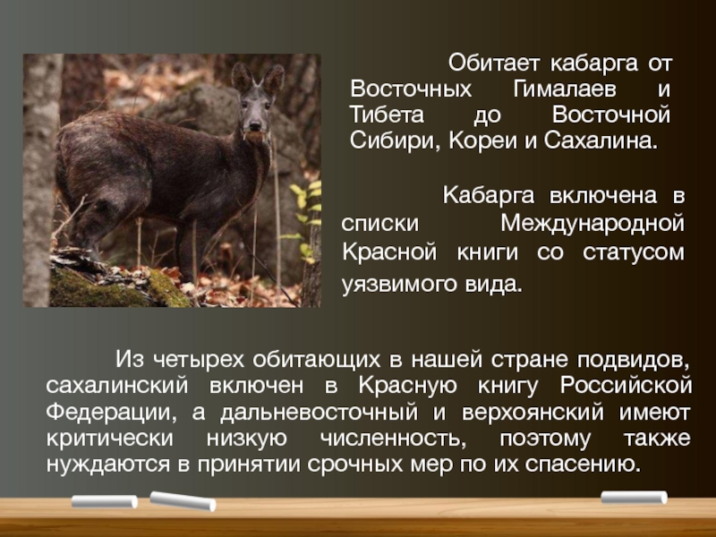 Кабарга включена в списки Международной Красной книги со статусом уязвимого вида.