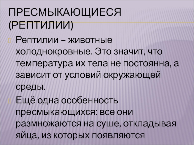 Ещё одна особенность пресмыкающихся: все они размножаются на суше, откладывая яйца, из которых появляются детеныши.