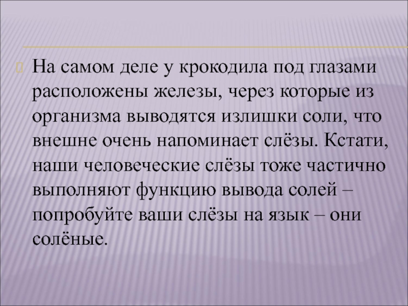 Слайд 14На самом деле у крокодила под глазами расположены железы, через которые