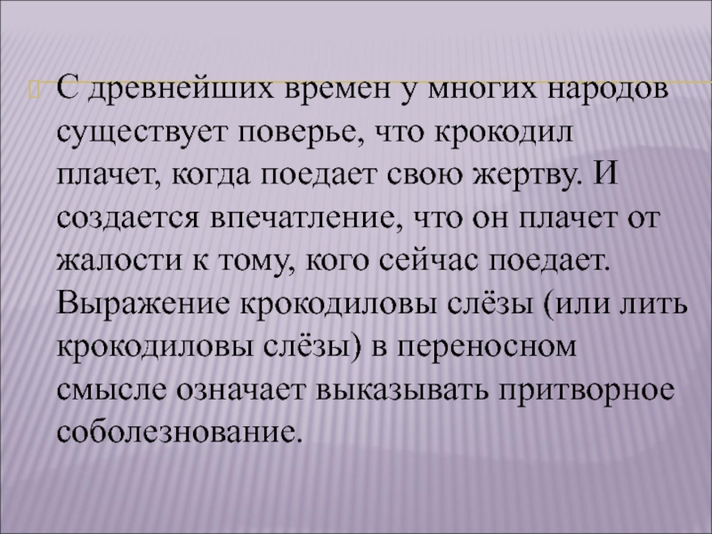 Слайд 13С древнейших времен у многих народов существует поверье, что крокодил плачет,