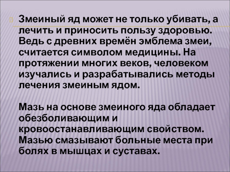 здоровью. Ведь с древних времён эмблема змеи, считается символом медицины. На протяжении многих веков, человеком изучались и разрабатывались методы лечения змеиным ядом.