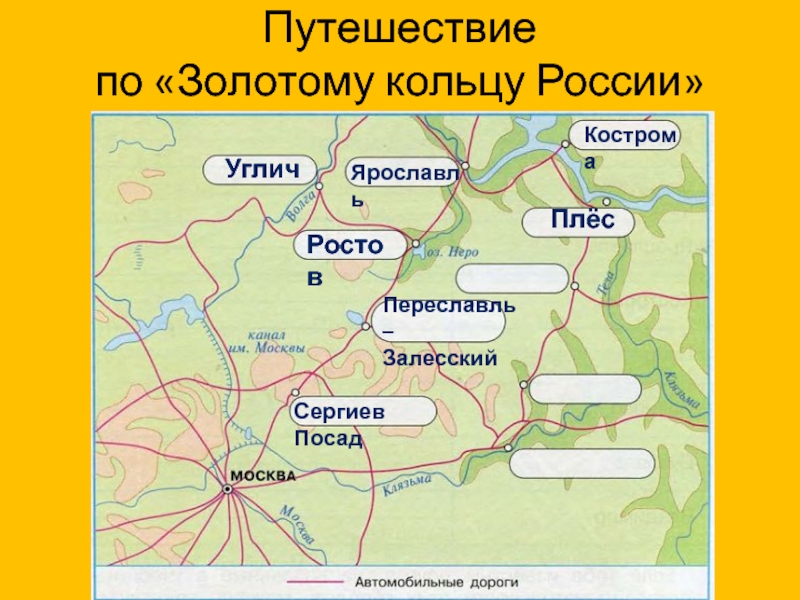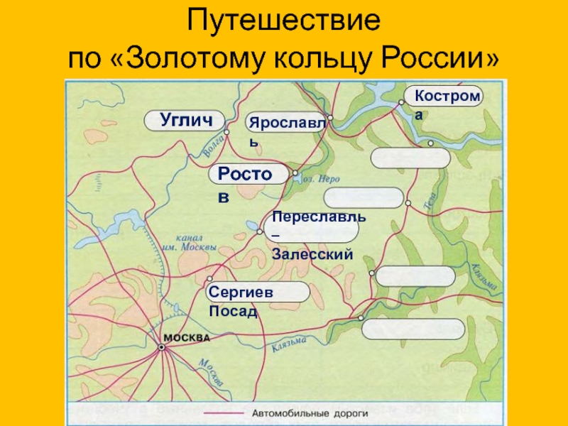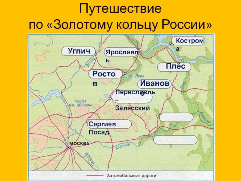 Путешествие  по «Золотому кольцу России»картаСергиев ПосадПереславль – ЗалесскийРостовУгличЯрославльКостромаПлёсИваново
