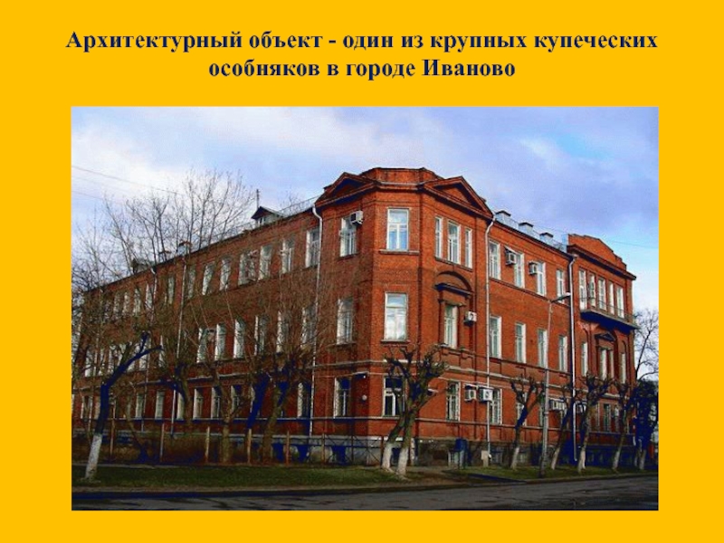 Слайд 25Архитектурный объект - один из крупных купеческих особняков в городе Иваново