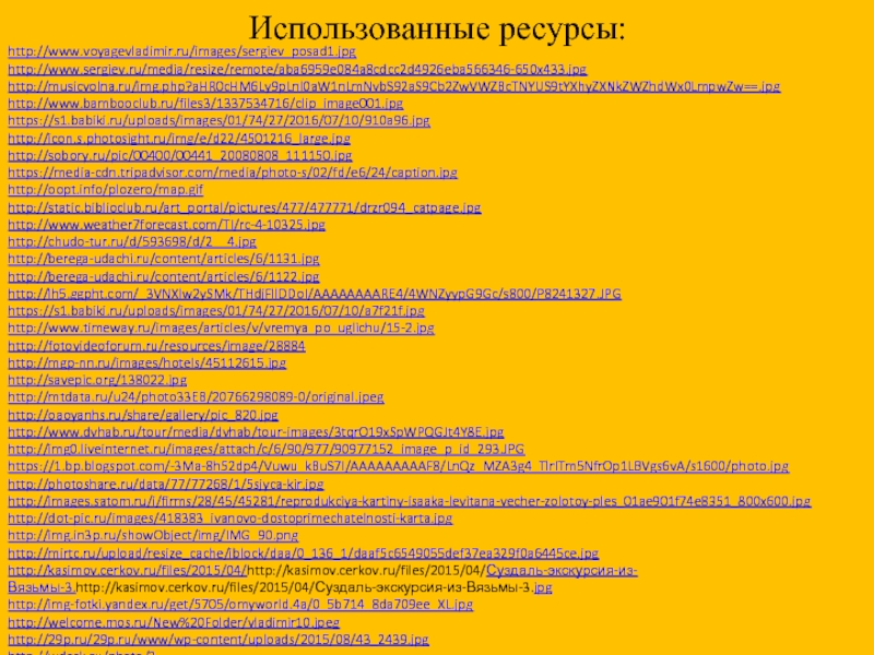 Использованные ресурсы:http://www.voyagevladimir.ru/images/sergiev_posad1.jpghttp://www.sergiev.ru/media/resize/remote/aba6959e084a8cdcc2d4926eba566346-650x433.jpghttp://musicvolna.ru/img.php?aHR0cHM6Ly9pLnl0aW1nLmNvbS92aS9Cb2ZwVWZBcTNYUS9tYXhyZXNkZWZhdWx0LmpwZw==.jpghttp://www.bambooclub.ru/files3/1337534716/clip_image001.jpghttps://s1.babiki.ru/uploads/images/01/74/27/2016/07/10/910a96.jpghttp://icon.s.photosight.ru/img/e/d22/4501216_large.jpghttp://sobory.ru/pic/00400/00441_20080808_111150.jpghttps://media-cdn.tripadvisor.com/media/photo-s/02/fd/e6/24/caption.jpghttp://oopt.info/plozero/map.gifhttp://static.biblioclub.ru/art_portal/pictures/477/477771/drzr094_catpage.jpghttp://www.weather7forecast.com/TI/rc-4-10325.jpghttp://chudo-tur.ru/d/593698/d/2__4.jpghttp://berega-udachi.ru/content/articles/6/1131.jpghttp://berega-udachi.ru/content/articles/6/1122.jpghttp://lh5.ggpht.com/_3VNXlw2ySMk/THdjFllDDoI/AAAAAAAARE4/4WNZyypG9Gc/s800/P8241327.JPGhttps://s1.babiki.ru/uploads/images/01/74/27/2016/07/10/a7f21f.jpghttp://www.timeway.ru/images/articles/v/vremya_po_uglichu/15-2.jpghttp://fotovideoforum.ru/resources/image/28884http://mgp-nn.ru/images/hotels/45112615.jpghttp://savepic.org/138022.jpghttp://mtdata.ru/u24/photo33EB/20766298089-0/original.jpeghttp://oaoyanhs.ru/share/gallery/pic_820.jpghttp://www.dvhab.ru/tour/media/dvhab/tour-images/3tqrO19xSpWPQGJt4Y8E.jpghttp://img0.liveinternet.ru/images/attach/c/6/90/977/90977152_image_p_id_293.JPGhttps://1.bp.blogspot.com/-3Ma-8h52dp4/Vuwu_kBuS7I/AAAAAAAAAF8/LnQz_MZA3g4_TlrITm5NfrOp1LBVgs6vA/s1600/photo.jpghttp://photoshare.ru/data/77/77268/1/5sjyca-kir.jpghttp://images.satom.ru/i/firms/28/45/45281/reprodukciya-kartiny-isaaka-levitana-vecher-zolotoy-ples_01ae901f74e8351_800x600.jpghttp://dot-pic.ru/images/418383_ivanovo-dostoprimechatelnosti-karta.jpghttp://img.in3p.ru/showObject/img/IMG_90.pnghttp://mirtc.ru/upload/resize_cache/iblock/daa/0_136_1/daaf5c6549055def37ea329f0a6445ce.jpghttp://kasimov.cerkov.ru/files/2015/04/http://kasimov.cerkov.ru/files/2015/04/Суздаль-экскурсия-из-Вязьмы-3.http://kasimov.cerkov.ru/files/2015/04/Суздаль-экскурсия-из-Вязьмы-3.jpghttp://img-fotki.yandex.ru/get/5705/omyworld.4a/0_5b714_8da709ee_XL.jpghttp://welcome.mos.ru/New%20Folder/vladimir10.jpeghttp://29p.ru/29p.ru/www/wp-content/uploads/2015/08/43_2439.jpghttp://wdesk.ru/photo/3