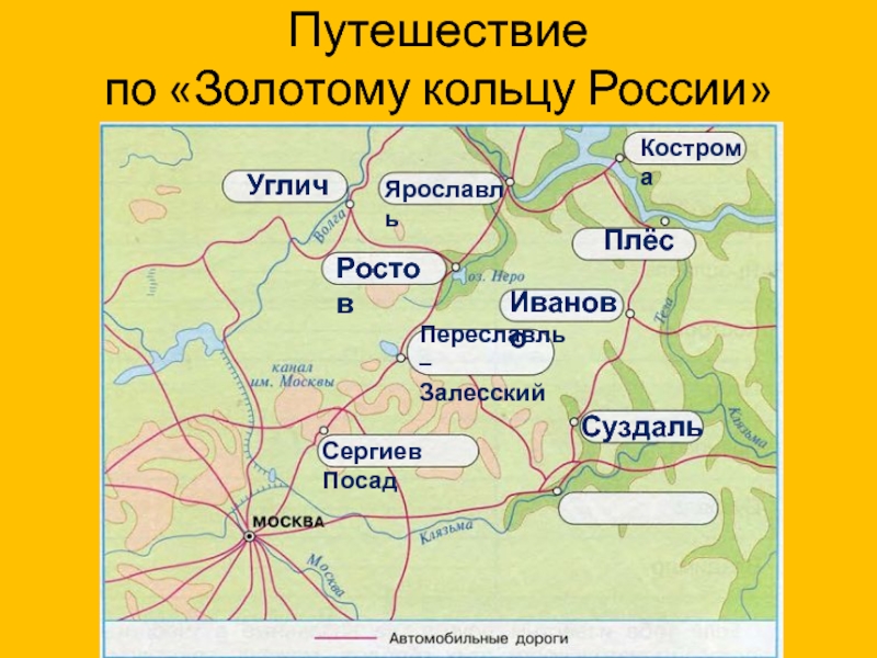 Путешествие  по «Золотому кольцу России»картаСергиев ПосадПереславль – ЗалесскийРостовУгличЯрославльКостромаПлёсИвановоСуздаль