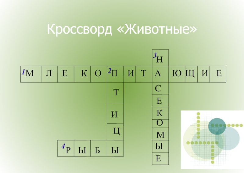 Кроссворд «Животные»ММЛ ЕЕККООПИ И Т Т АЮЩИ Е ЕЫ Ы Ы Ц РБ Н С1 234