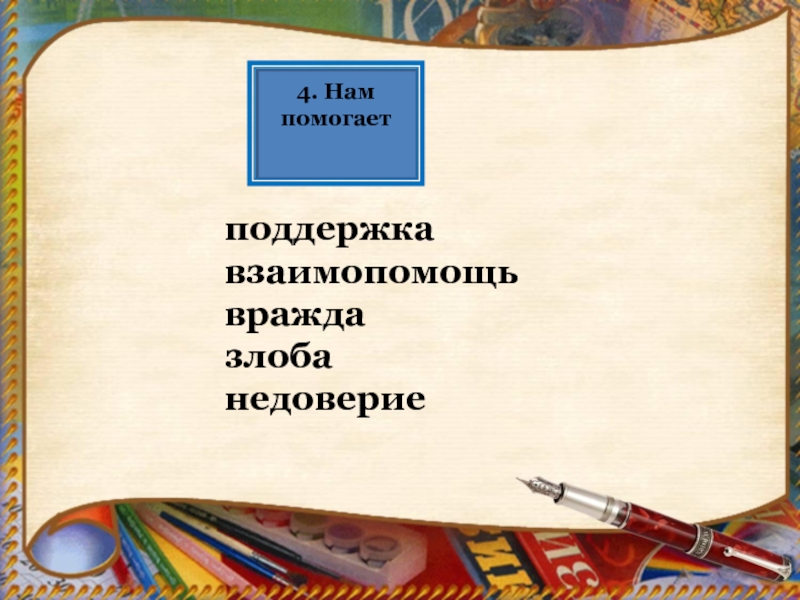 поддержкавзаимопомощьвраждазлобанедоверие4. Нам помогает