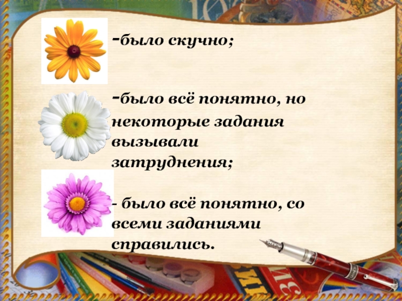 -было скучно;-было всё понятно, но некоторые задания вызывали затруднения;- было всё понятно, со всеми заданиями справились.