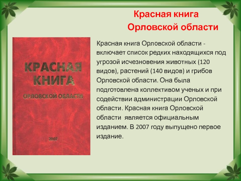 Красная книга Орловской области - включает список редких находящихся под угрозой исчезновения животных (120 видов), растений (140 видов) и грибов Орловской области. Она была подготовлена коллективом ученых и при содействии администрации Орловской области. Красная книга Орловской области является официальным изданием. В 2007 году выпущено первое издание.