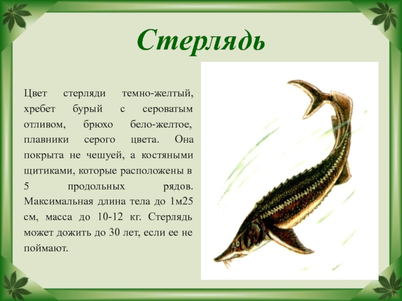 серого цвета. Она покрыта не чешуей, а костяными щитиками, которые расположены в 5 продольных рядов. Максимальная длина тела до 1м25 см, масса до 10-12 кг. Стерлядь может дожить до 30 лет, если ее не поймают.
