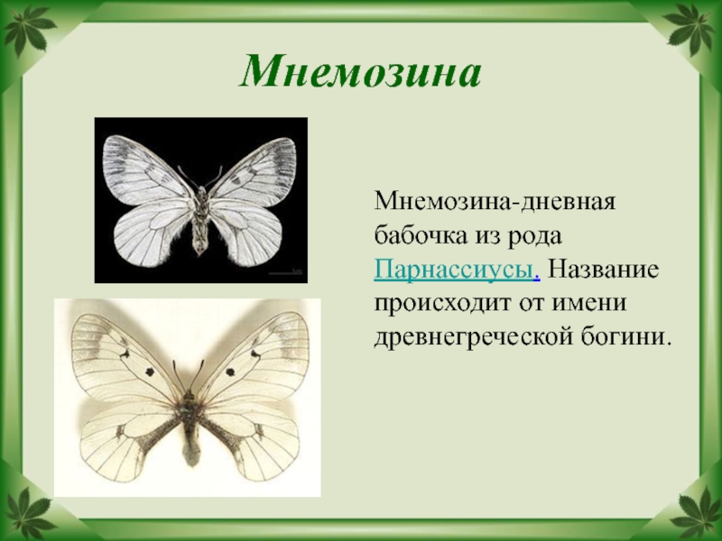 Мнемозина-дневная бабочка из рода Парнассиусы. Название происходит от имени древнегреческой богини.