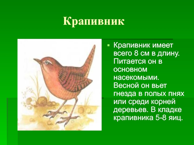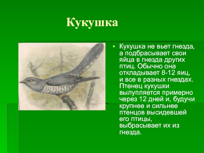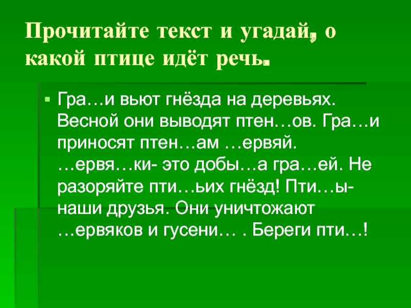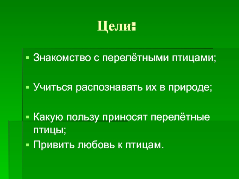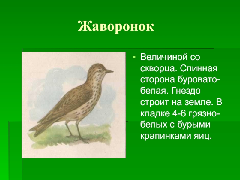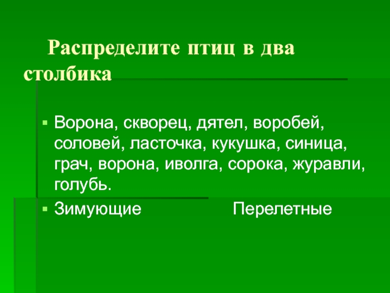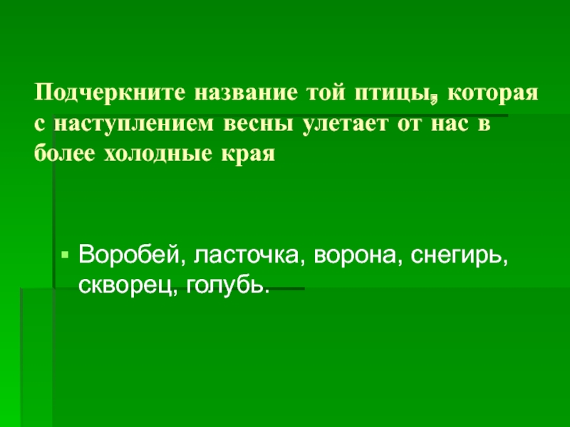 Воробей, ласточка, ворона, снегирь, скворец, голубь.