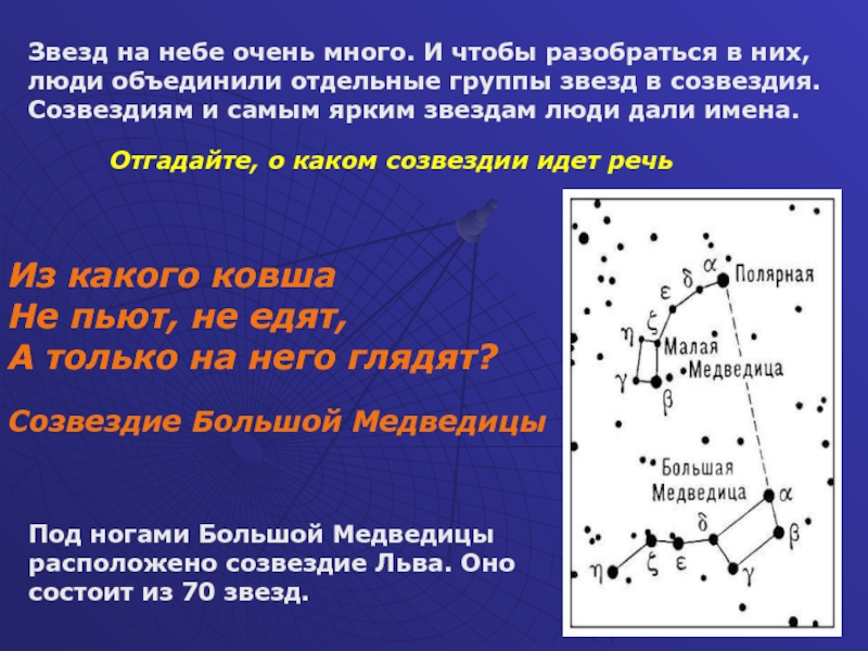 Под ногами Большой Медведицы расположено созвездие Льва. Оно состоит из 70 звезд.