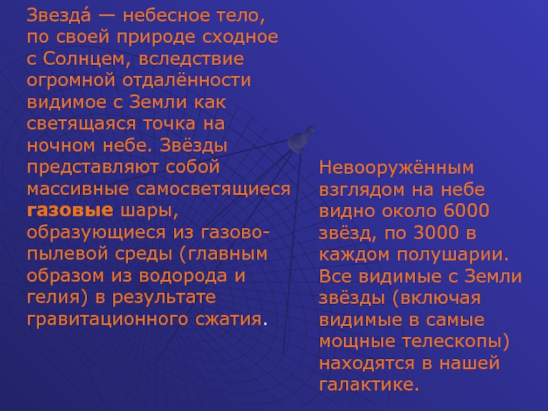 Невооружённым взглядом на небе видно около 6000 звёзд, по 3000 в каждом полушарии. Все видимые с Земли звёзды (включая видимые в самые мощные телескопы) находятся в нашей галактике.