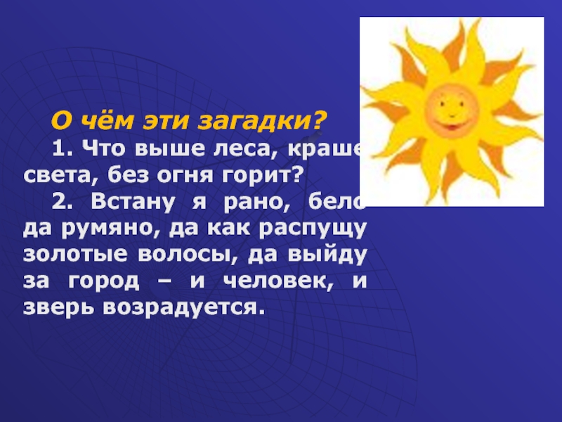 Это наша звезда, дающая нам жизнь. Из-за него днём все остальные космические объекты становятся невидимы. Солнце выделяет свет и тепло, до тех пор, пока не зайдёт за горизонт. И только потом небо становится достаточно тёмным, чтоб увидеть остальные звёзды.