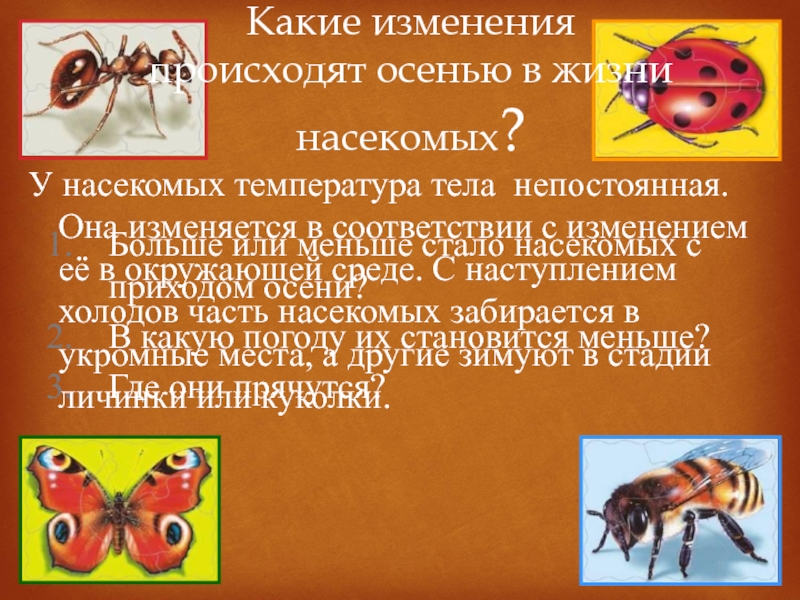 У насекомых температура тела непостоянная. Она изменяется в соответствии с изменением её в окружающей среде. С наступлением холодов часть насекомых забирается в укромные места, а другие зимуют в стадии личинки или куколки.
