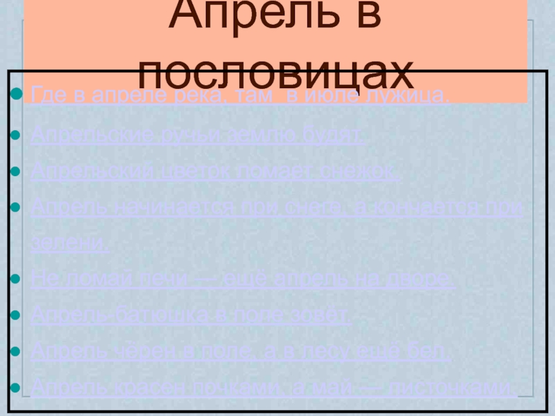 Апрель в пословицахГде в апреле река, там в июле лужица. Апрельские ручьи землю будят.Апрельский цветок ломает снежок.Апрель