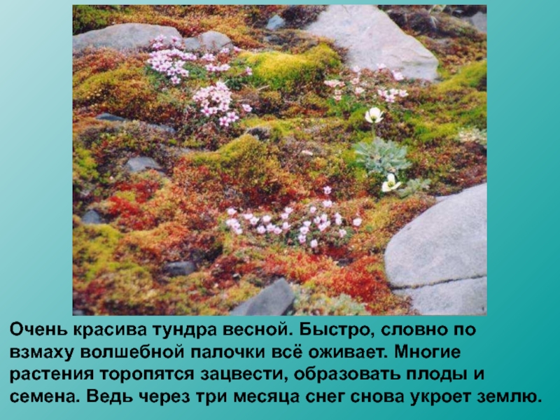 Слайд 12Очень красива тундра весной. Быстро, словно по взмаху волшебной палочки всё