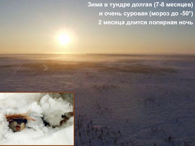 Слайд 5Зима в тундре долгая (7-8 месяцев)