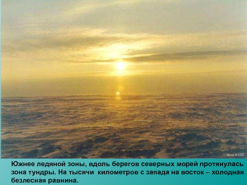 Слайд 4Южнее ледяной зоны, вдоль берегов северных морей протянулась зона тундры. На