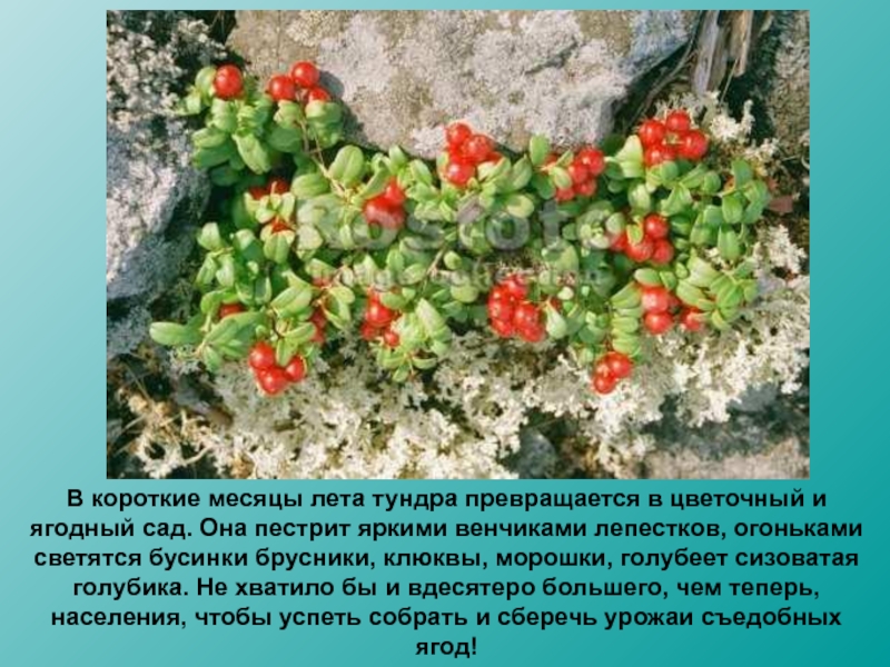 Слайд 17В короткие месяцы лета тундра превращается в цветочный и ягодный сад.
