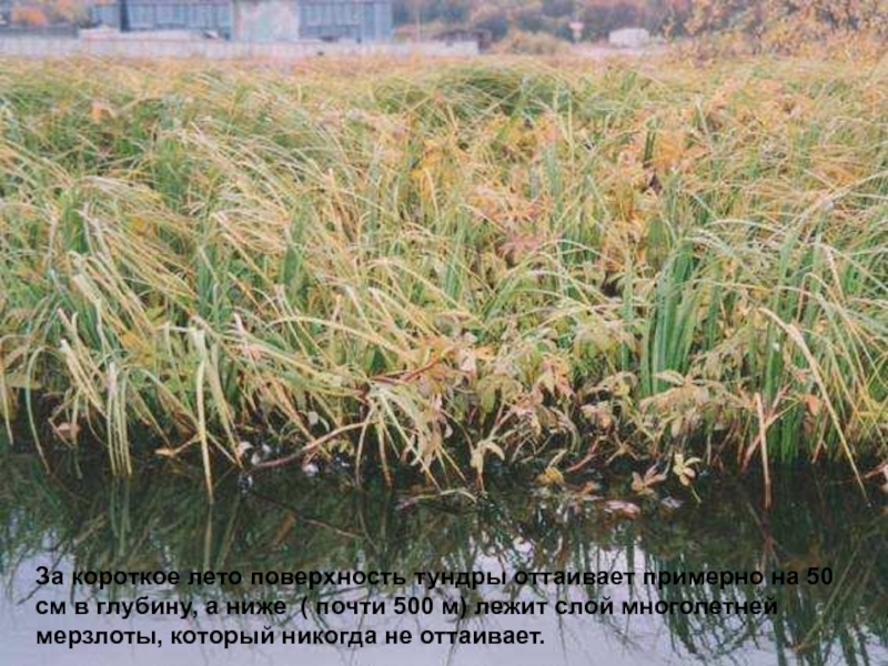 Слайд 8За короткое лето поверхность тундры оттаивает примерно на 50 см в