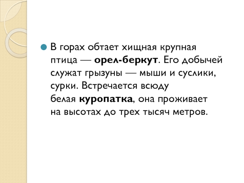 Слайд 39В горах обтает хищная крупная птица — орел-беркут. Его добычей служат грызуны — мыши и суслики,
