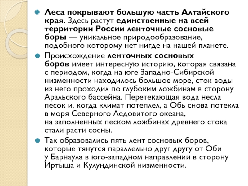 Так образовались пять лент сосновых боров, которые тянутся параллельно друг другу от Оби у Барнаула в юго-западном направлении в сторону Иртыша и Кулундинской низменности.