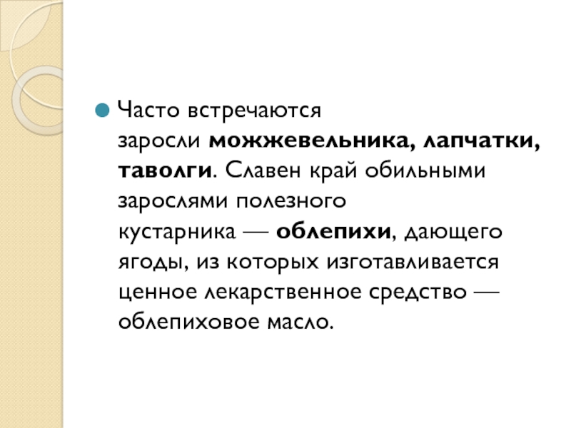 Слайд 17Часто встречаются заросли можжевельника, лапчатки, таволги. Славен край обильными зарослями полезного кустарника — облепихи,