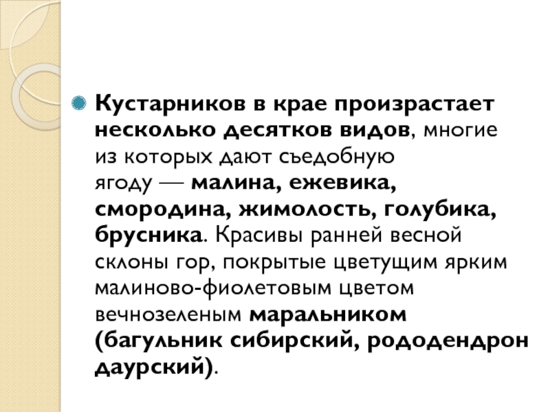 Слайд 15Кустарников в крае произрастает несколько десятков видов, многие из которых дают съедобную ягоду — малина,