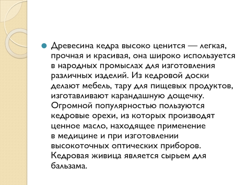 Слайд 11Древесина кедра высоко ценится — легкая, прочная и красивая, она широко используется в народных
