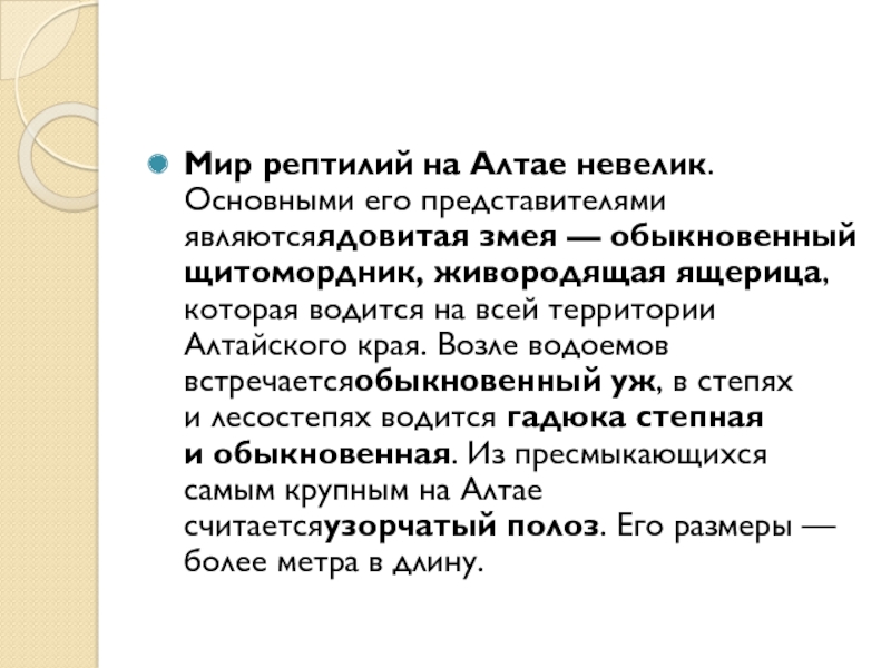 Слайд 43Мир рептилий на Алтае невелик. Основными его представителями являютсяядовитая змея — обыкновенный щитомордник,