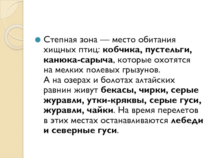 полевых грызунов. А на озерах и болотах алтайских равнин живут бекасы, чирки, серые журавли, утки-кряквы, серые гуси, журавли, чайки. На время перелетов в этих местах останавливаются лебеди и северные гуси.