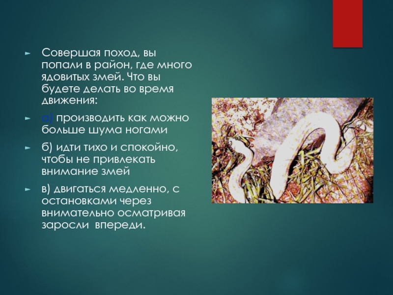 Слайд 49Совершая поход, вы попали в район, где много ядовитых змей. Что