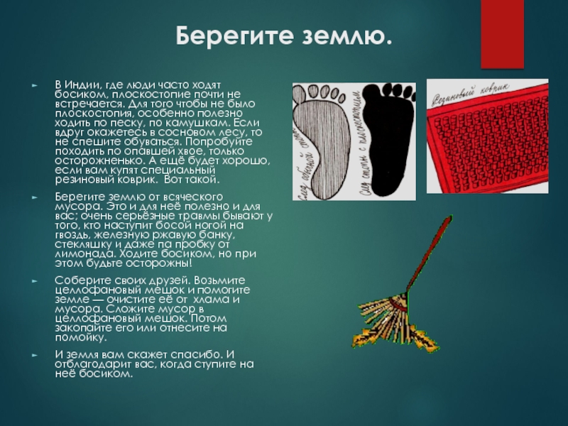 Берегите землю от всяческого мусора. Это и для неё полезно и для вас; очень серьёзные травмы бывают у того, кто наступит босой ногой на гвоздь, железную ржавую банку, стекляшку и даже па пробку от лимонада. Ходите босиком, но при этом будьте осторожны!