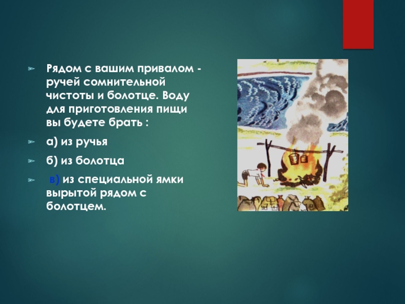 Слайд 50Рядом с вашим привалом - ручей сомнительной чистоты и болотце. Воду