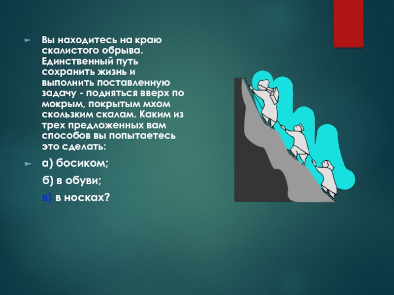 Слайд 46Вы находитесь на краю скалистого обрыва. Единственный путь сохранить жизнь и