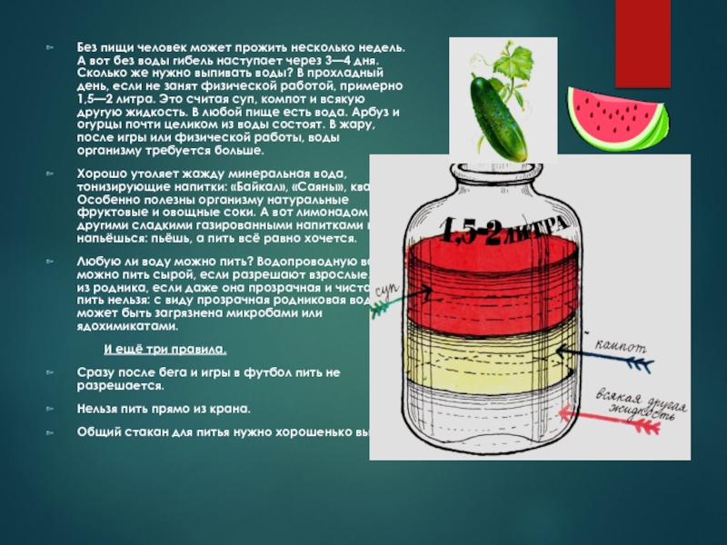 гибель наступает через 3—4 дня. Сколько же нужно выпивать воды? В прохладный день, если не занят физической работой, примерно 1,5—2 литра. Это считая суп, компот и всякую другую жидкость. В любой пище есть вода. Арбуз и огурцы почти целиком из воды состоят. В жару, после игры или физической работы, воды организму требуется больше.