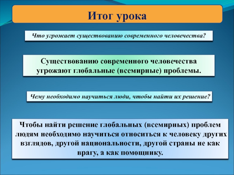 Чтобы найти решение глобальных (всемирных) проблем людям необходимо научиться относиться к человеку других взглядов, другой национальности, другой страны не как врагу, а как помощнику.