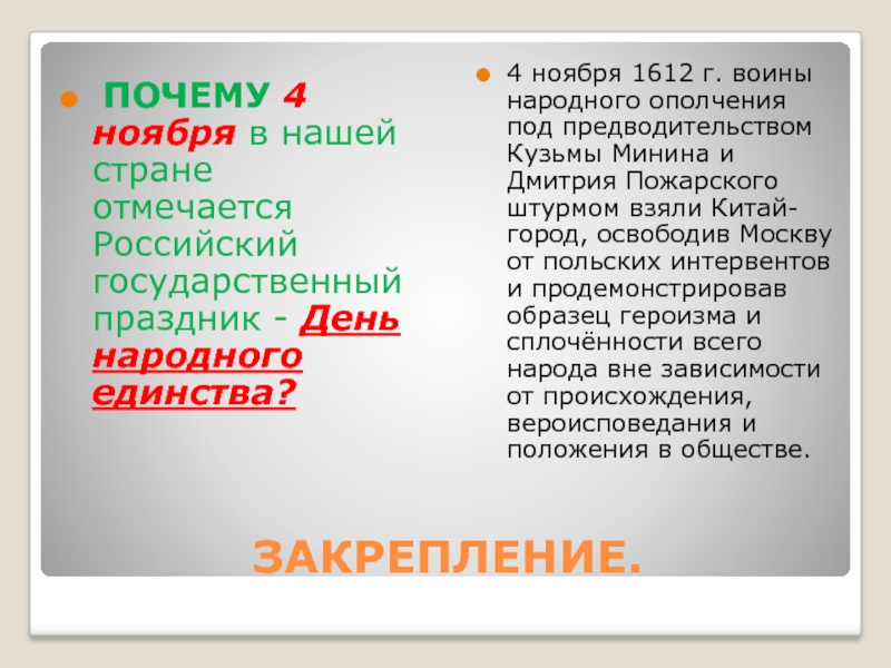 4 ноября 1612 г. воины народного ополчения под предводительством Кузьмы Минина и Дмитрия Пожарского штурмом взяли Китай-город, освободив Москву от польских интервентов и продемонстрировав образец героизма и сплочённости всего народа вне зависимости от происхождения, вероисповедания и положения в обществе.