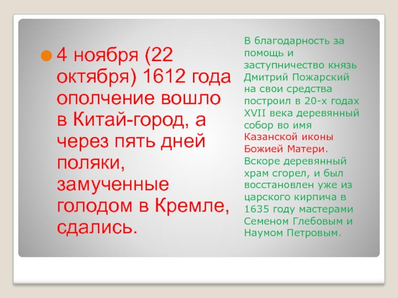 4 ноября (22 октября) 1612 года ополчение вошло в Китай-город, а через пять дней поляки, замученные голодом в Кремле, сдались.