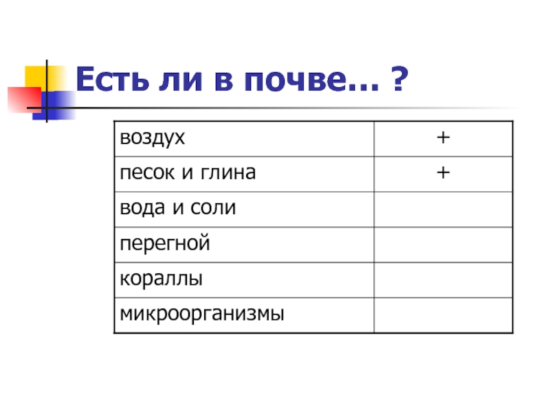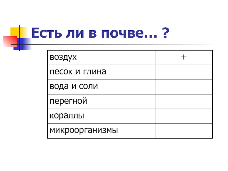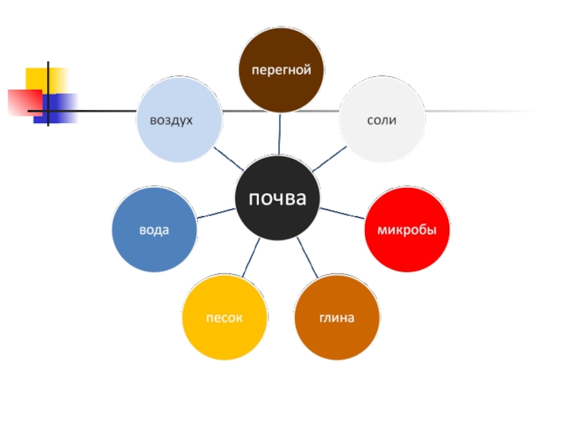 В структуру почвы входит: воздух, вода, соли, перегной и микроорганизмы.