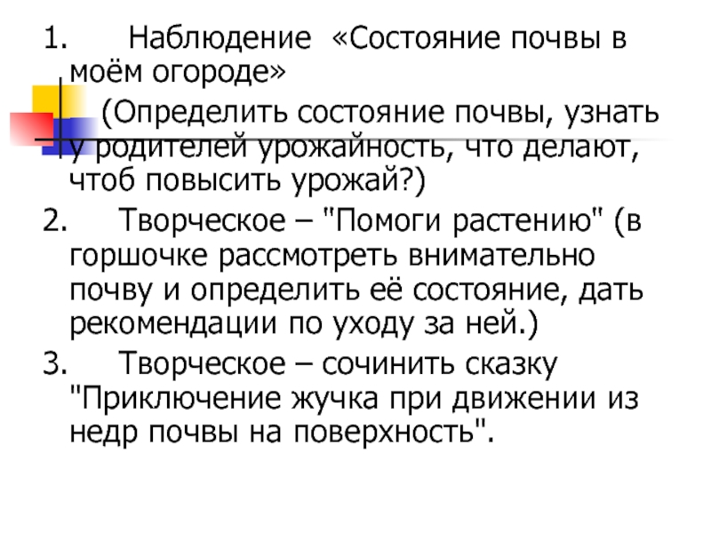 (Определить состояние почвы, узнать у родителей урожайность, что делают, чтоб повысить урожай?)